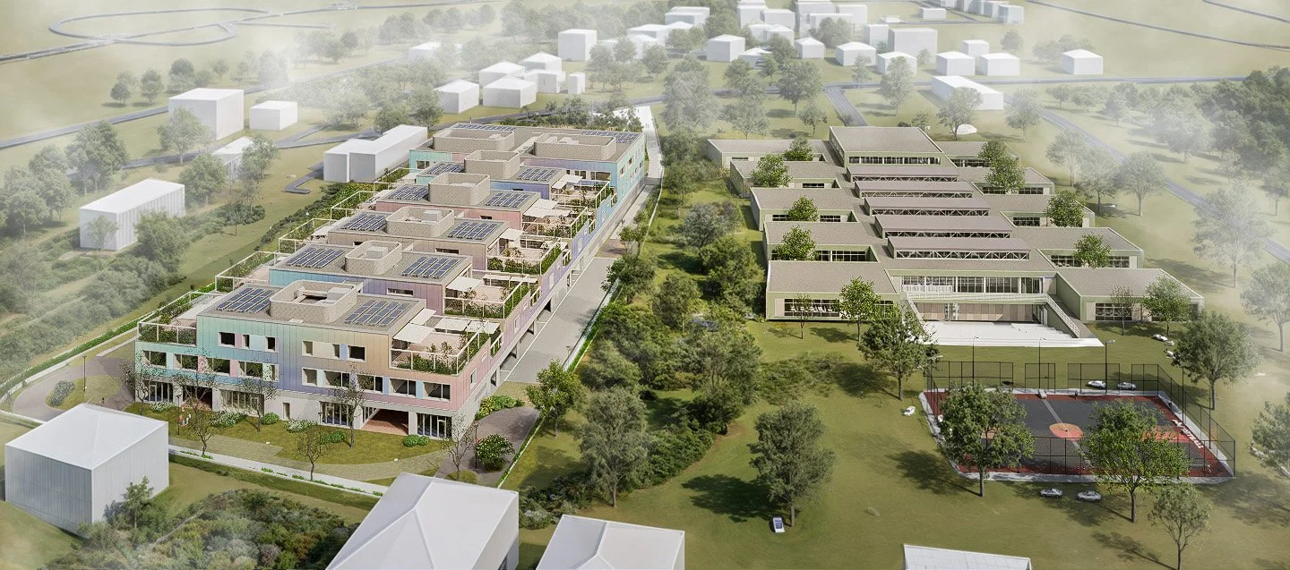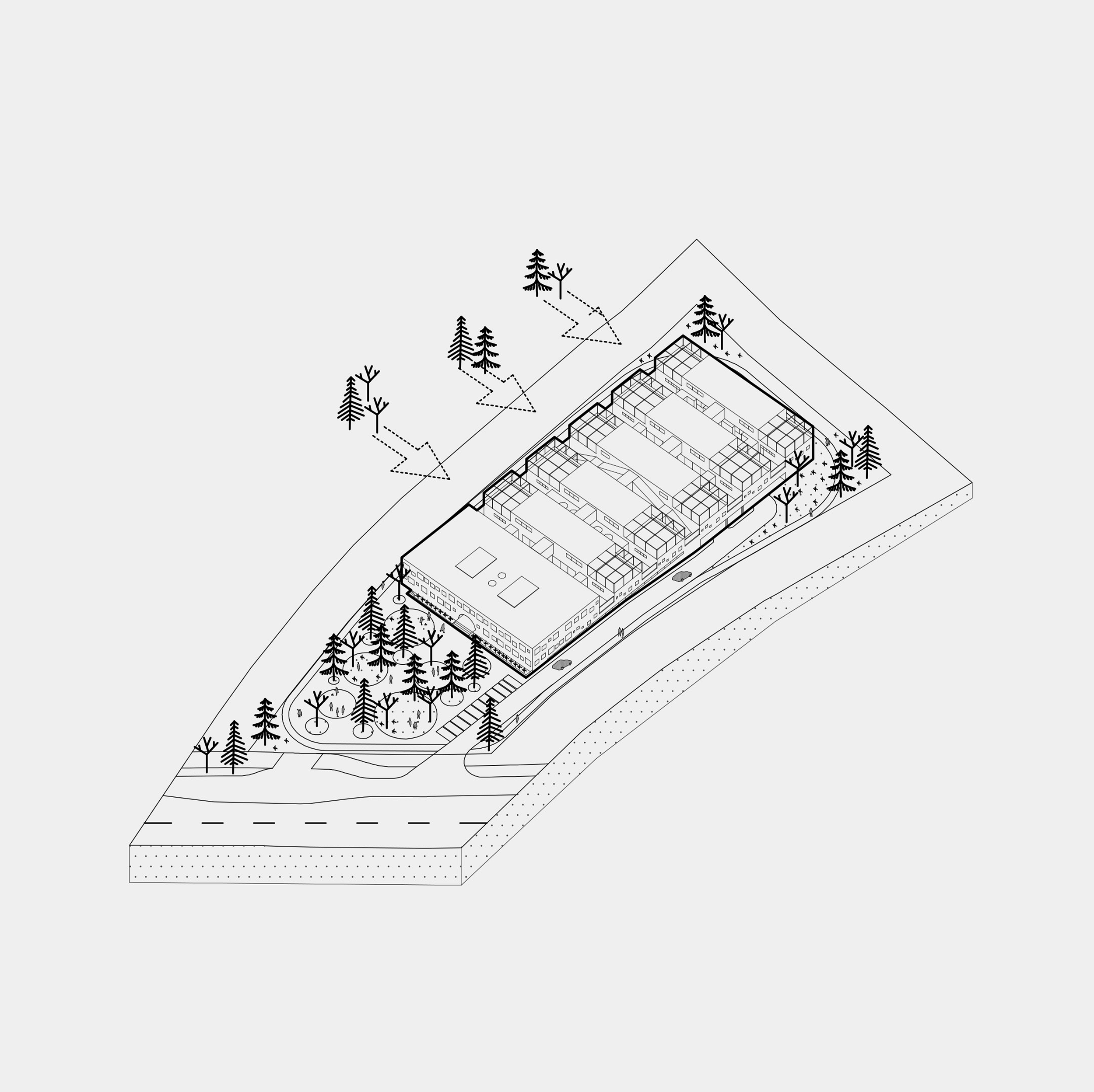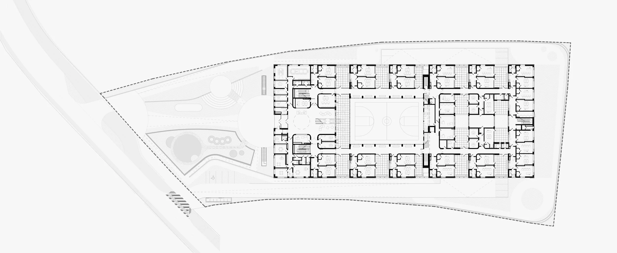 Zamišljena je niska dvojna struktura koja prekriva središnji dio parcele. Unutar nje formirani su atriji, čime se odgojni proces olakšava smanjenjem distrakcija. Veličina kompleksa dovodi se u mjerilo prikladno okruženju i korisnicima te se omogućuje kvalitetna orijentacija svih unutarnjih jedinica.