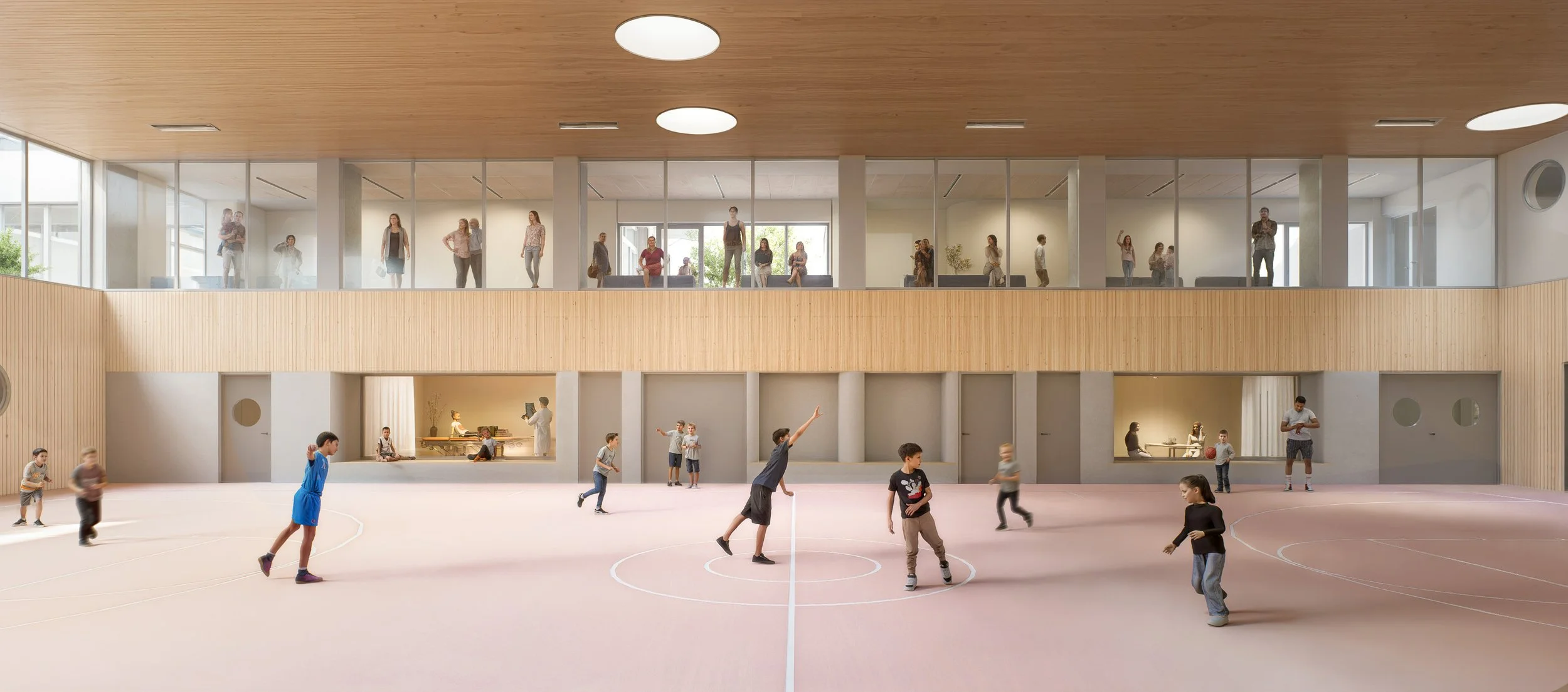 Boravišni prostori smješteni su prizemno i imaju direktan kontakt s terenom, kako bi se stvorili uvjeti za održavanje nastave na otvorenom i time zadovoljile i fiziološke potrebe pravilnog razvoja učenika boravkom na vanjskom zraku.