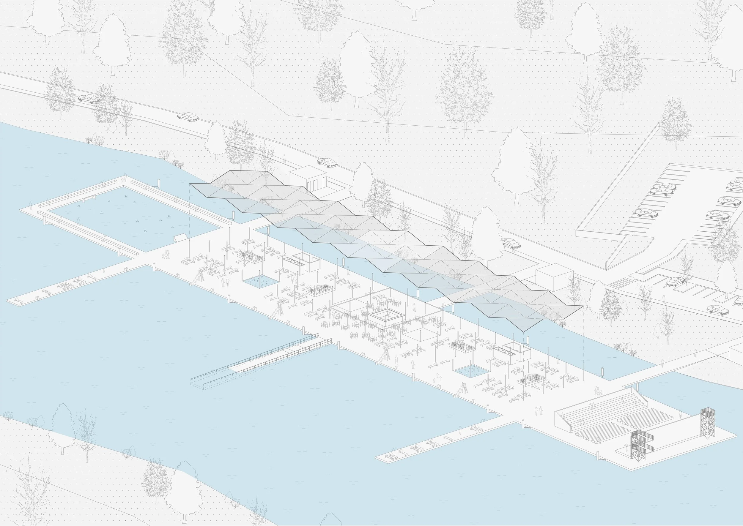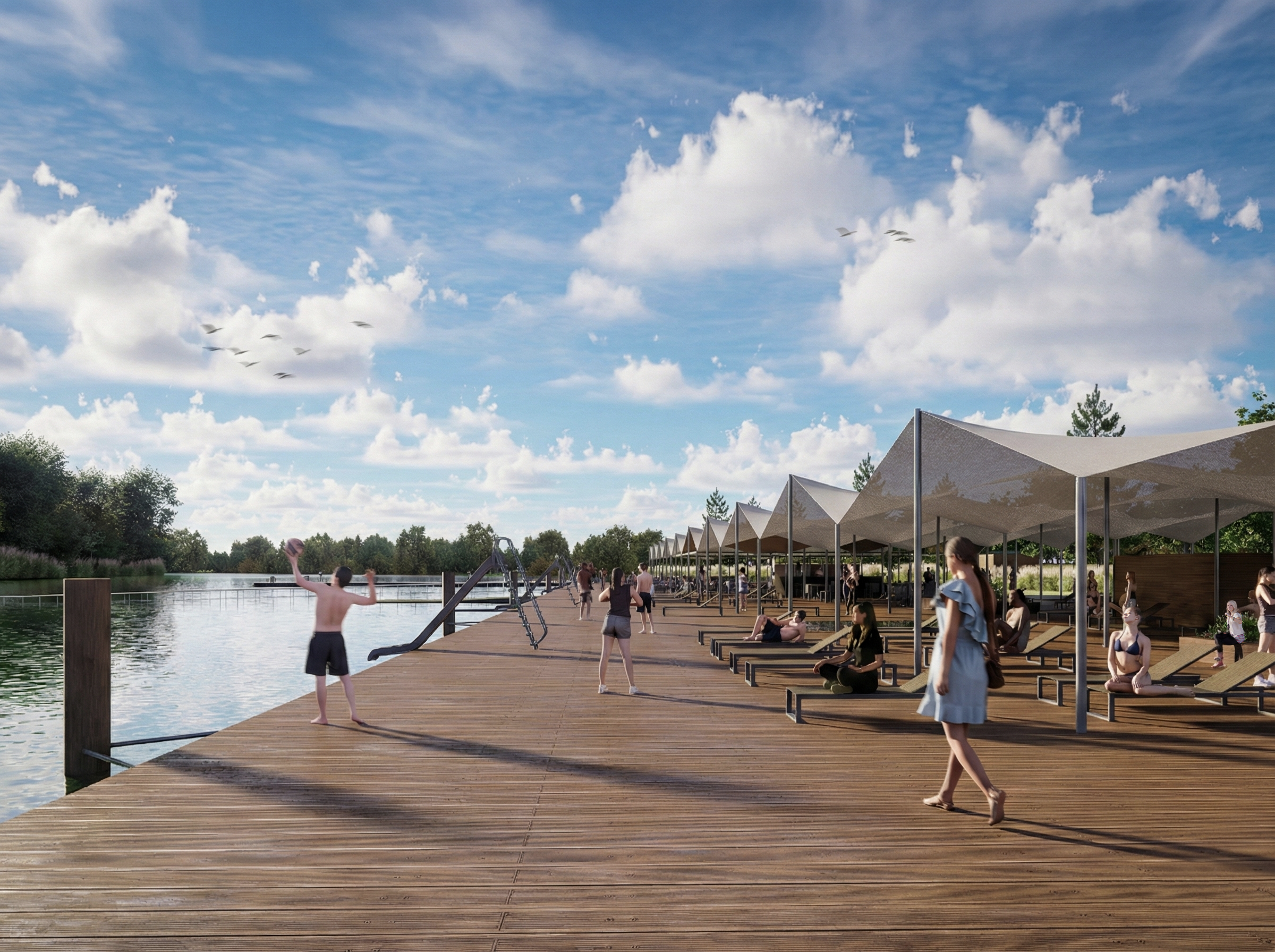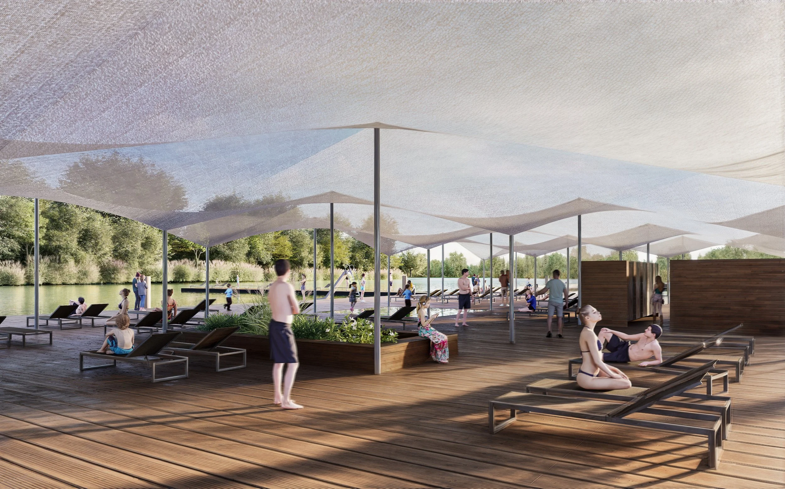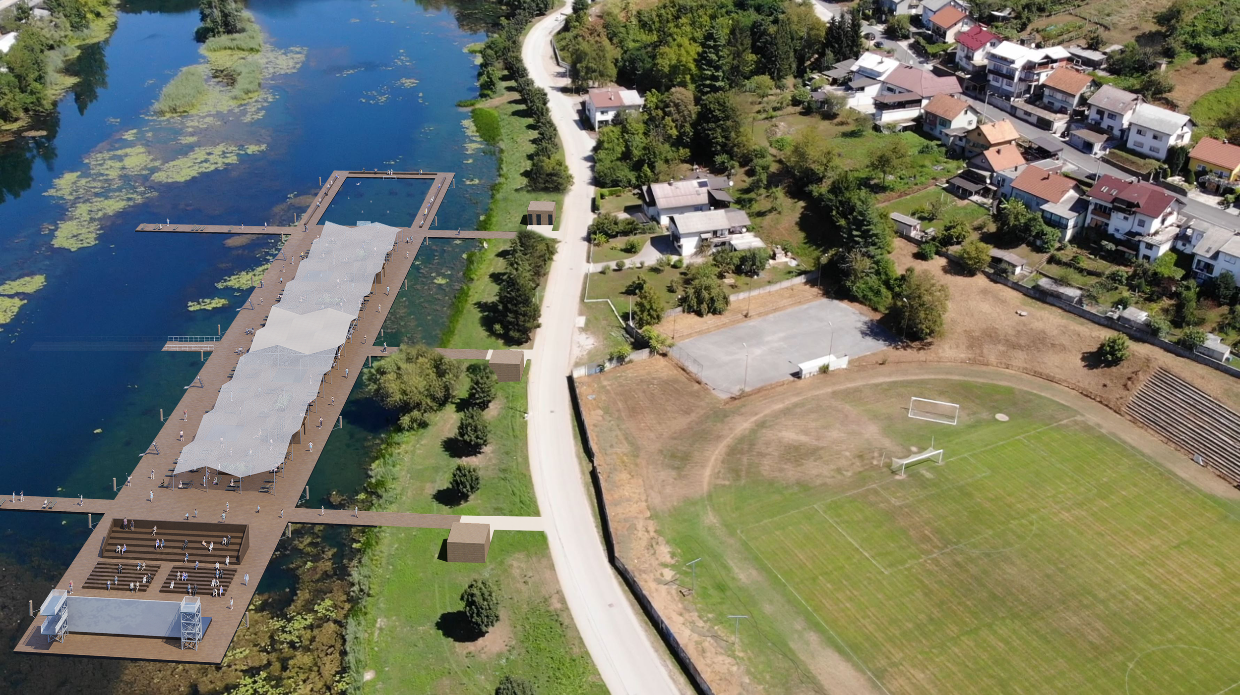 Sadržaji su organizirani prema intenzitetu aktivnosti i karakteru okupljanja: kupališta i sunčališta s platformama za skokove različitih visina prate morfologiju rijeke, otvoreni vaterpolo teren s funkcionalnim tribinama uvodi element sportskog spektakla, a središnji ugostiteljski punkt postavljen je kao spontana zona boravka i socijalizacije.