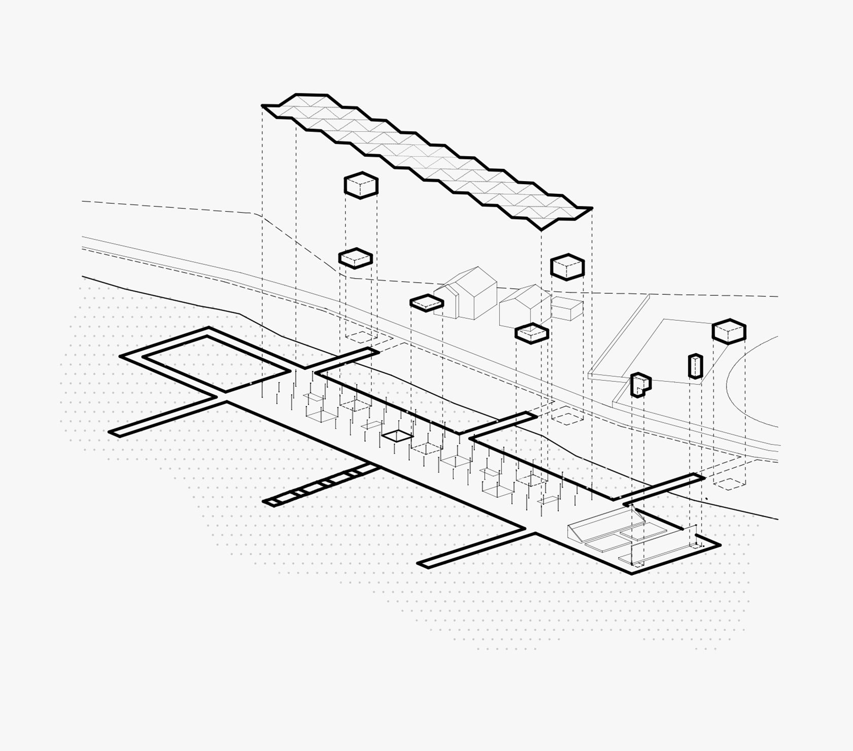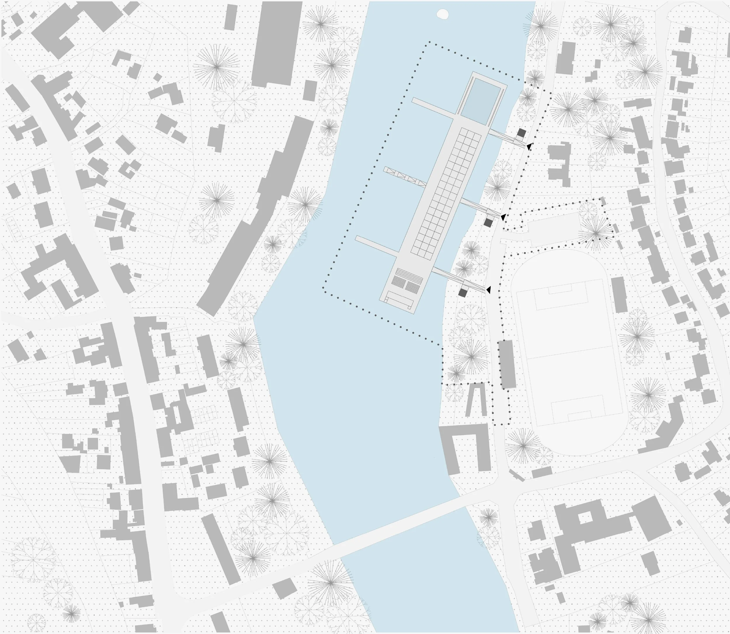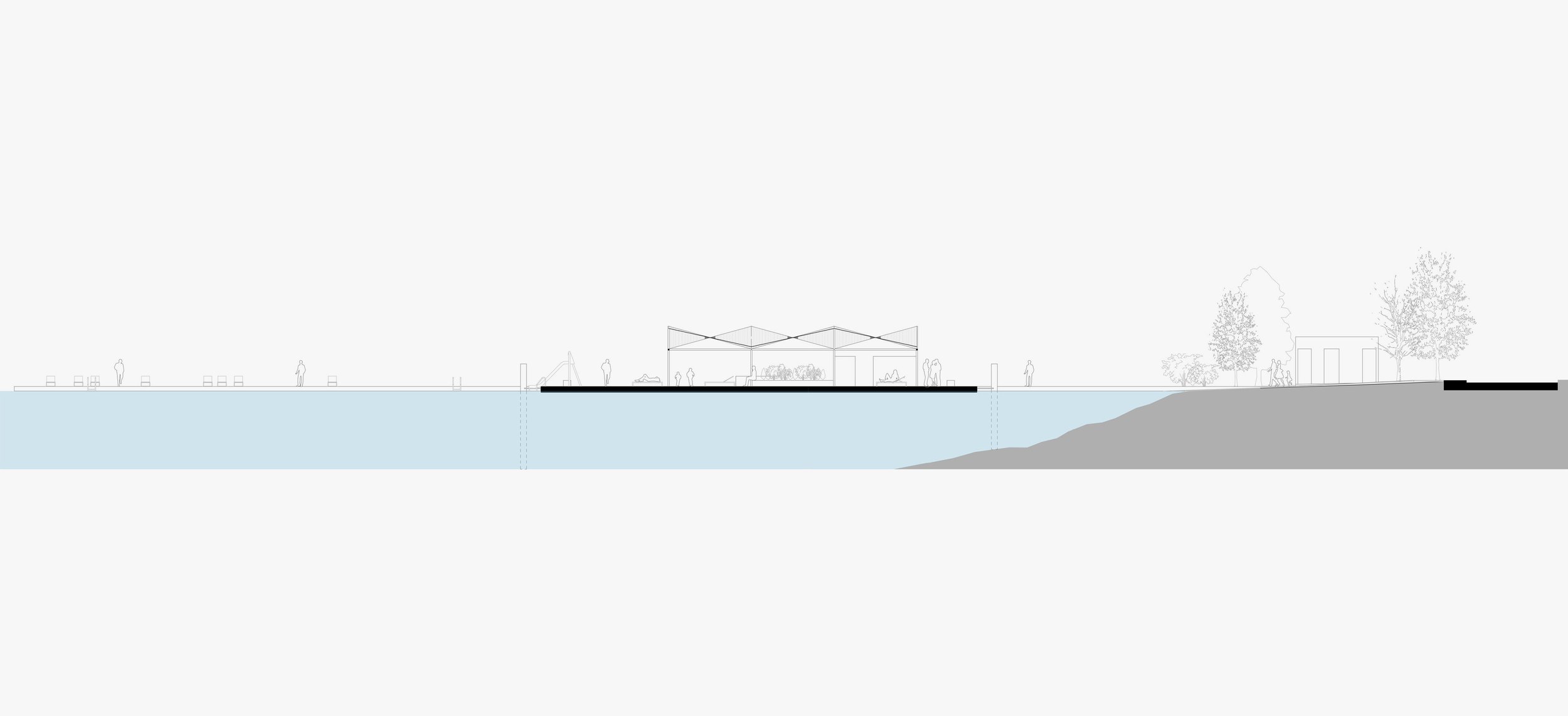 Plutajuća modularna pontonska platforma postavlja se kao transformabilni element koji prati dinamiku vodostaja i sezonske potrebe. Sustav omogućuje prilagodbu gabarita i programa – platforma se može proširivati, reducirati ili rekonfigurirati. Modularnost nije tehnička demonstracija, već operativni princip koji ostavlja prostora za promjenu.