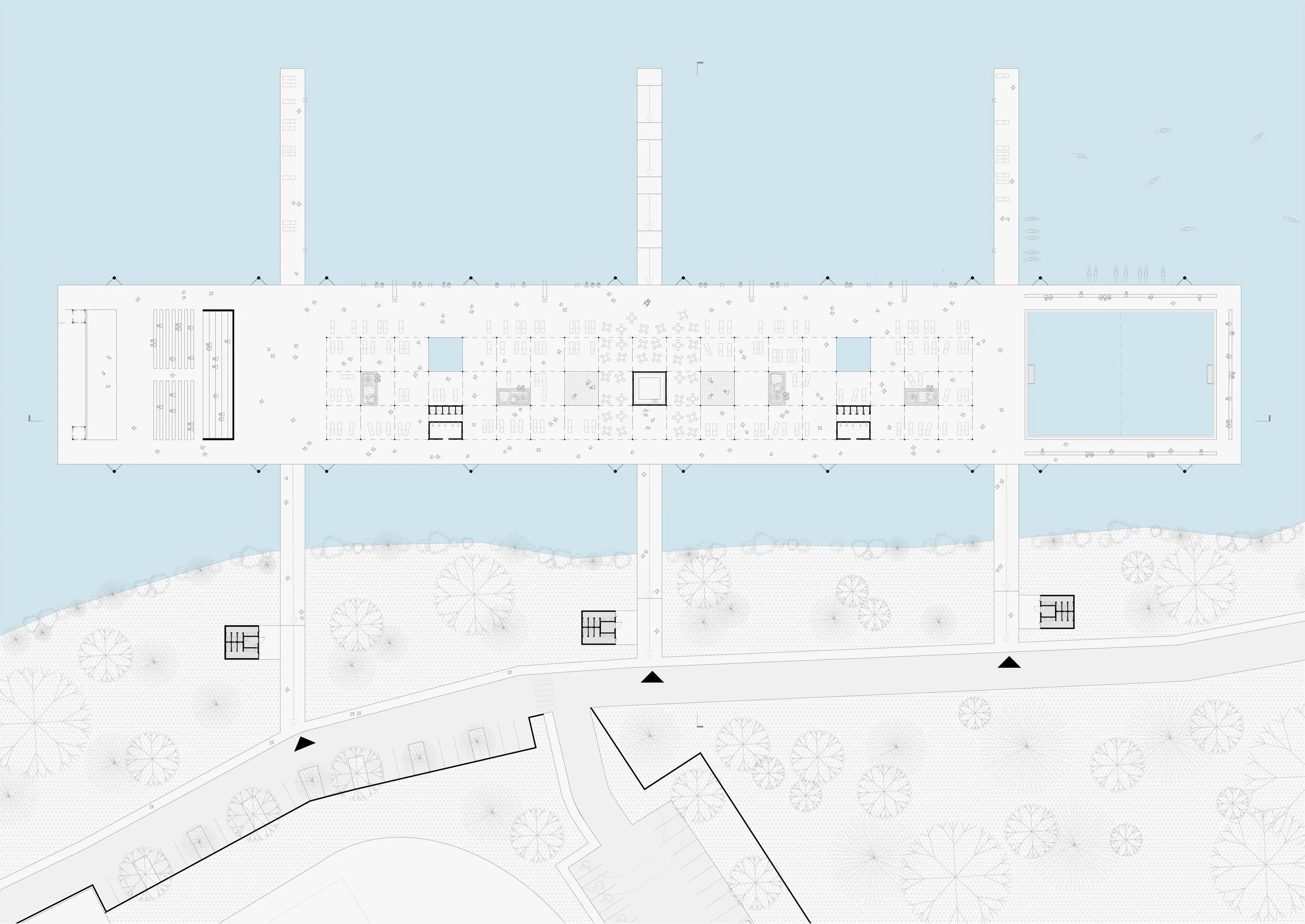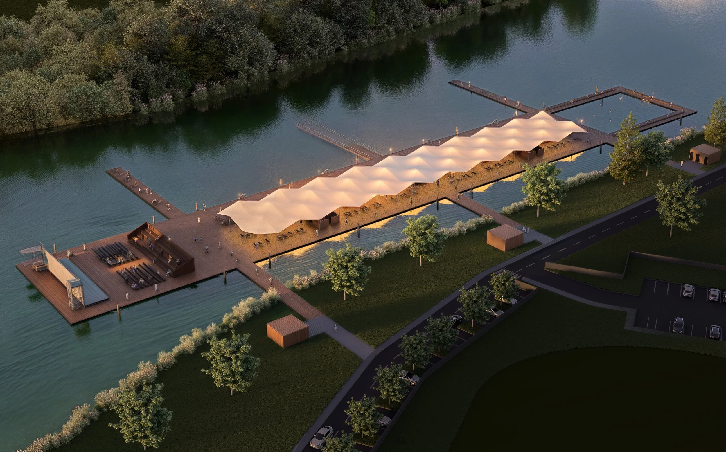 Završni segment platforme organiziran je kao teatar ili ljetno kino – nova mikro-scena koja proširuje kulturnu infrastrukturu grada. Servisni sadržaji smješteni su na obali i povezani lakim pješačkim mostovima koji ne narušavaju vizuru krajolika.