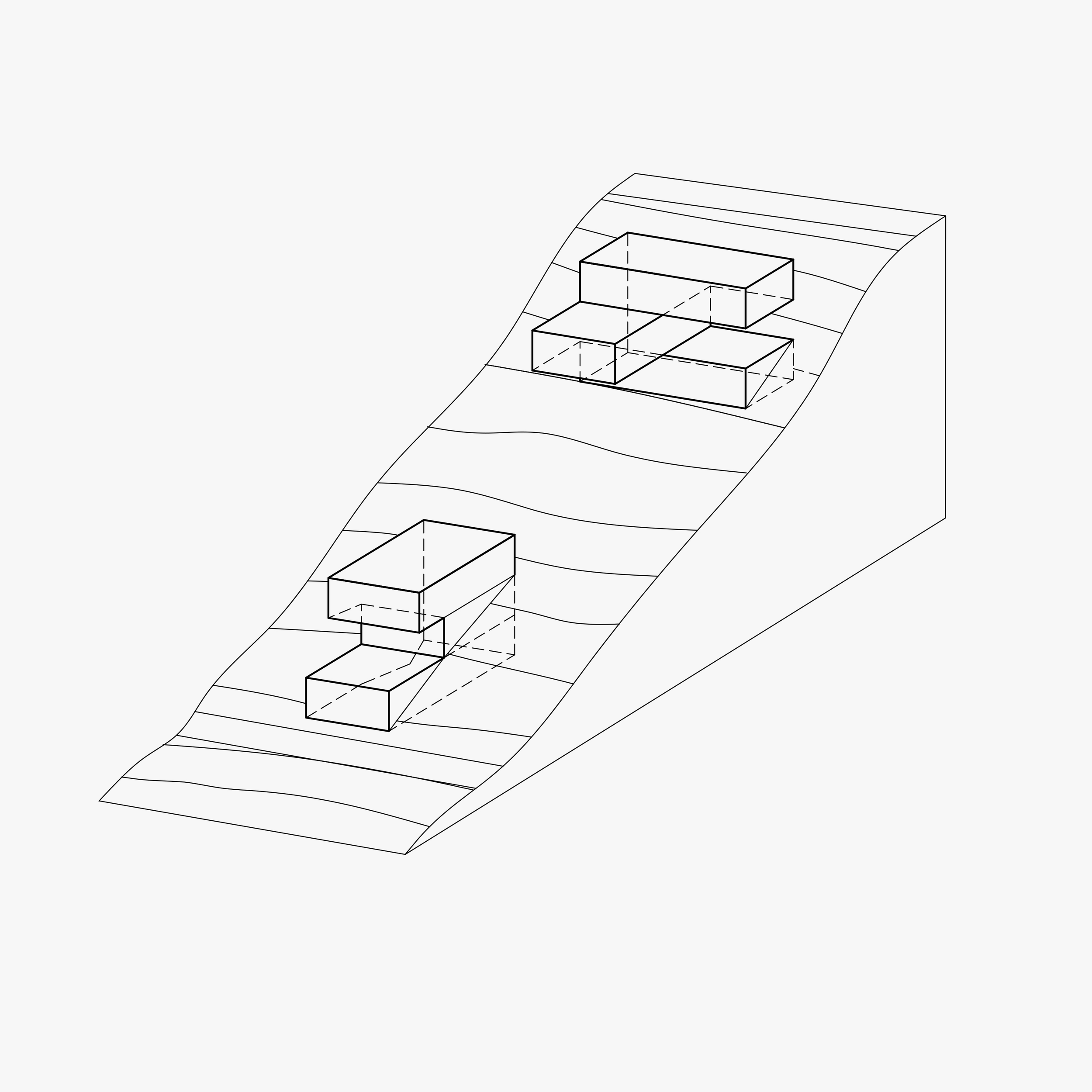Relativno veliki volumeni kuća u odnosu na veličinu čestice usitnjeni su u tri približno jednaka kubusa po kući postavljena tako da svojim međuodnosima stvaraju raznolike vanjske prostore ugodne za boravak.