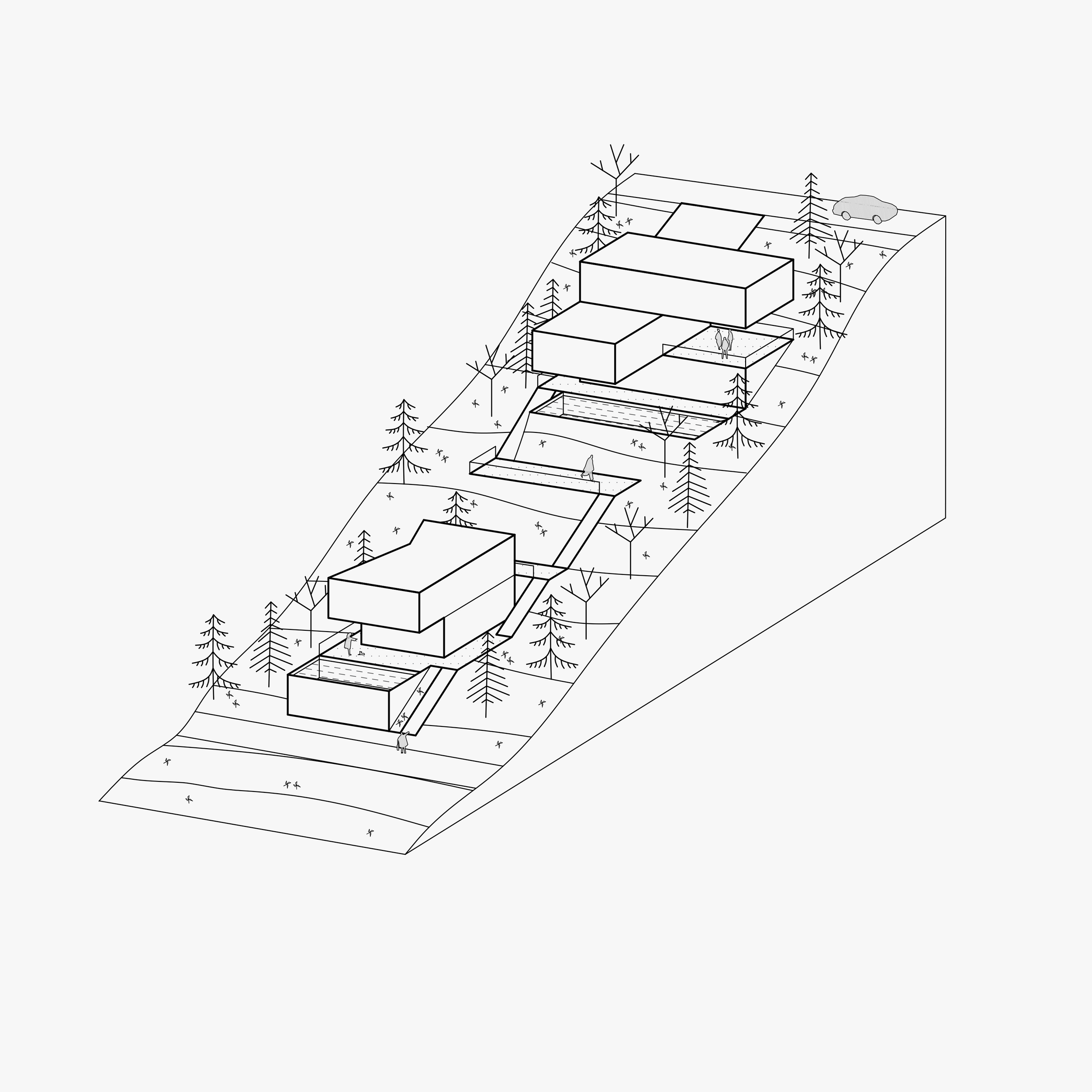 Posebna je pažnja posvećena oblikovanju velikih horizontalnih vanjskih prostora oko kojih se odvija čitav cjelodnevni i večernji ritam korištenja.