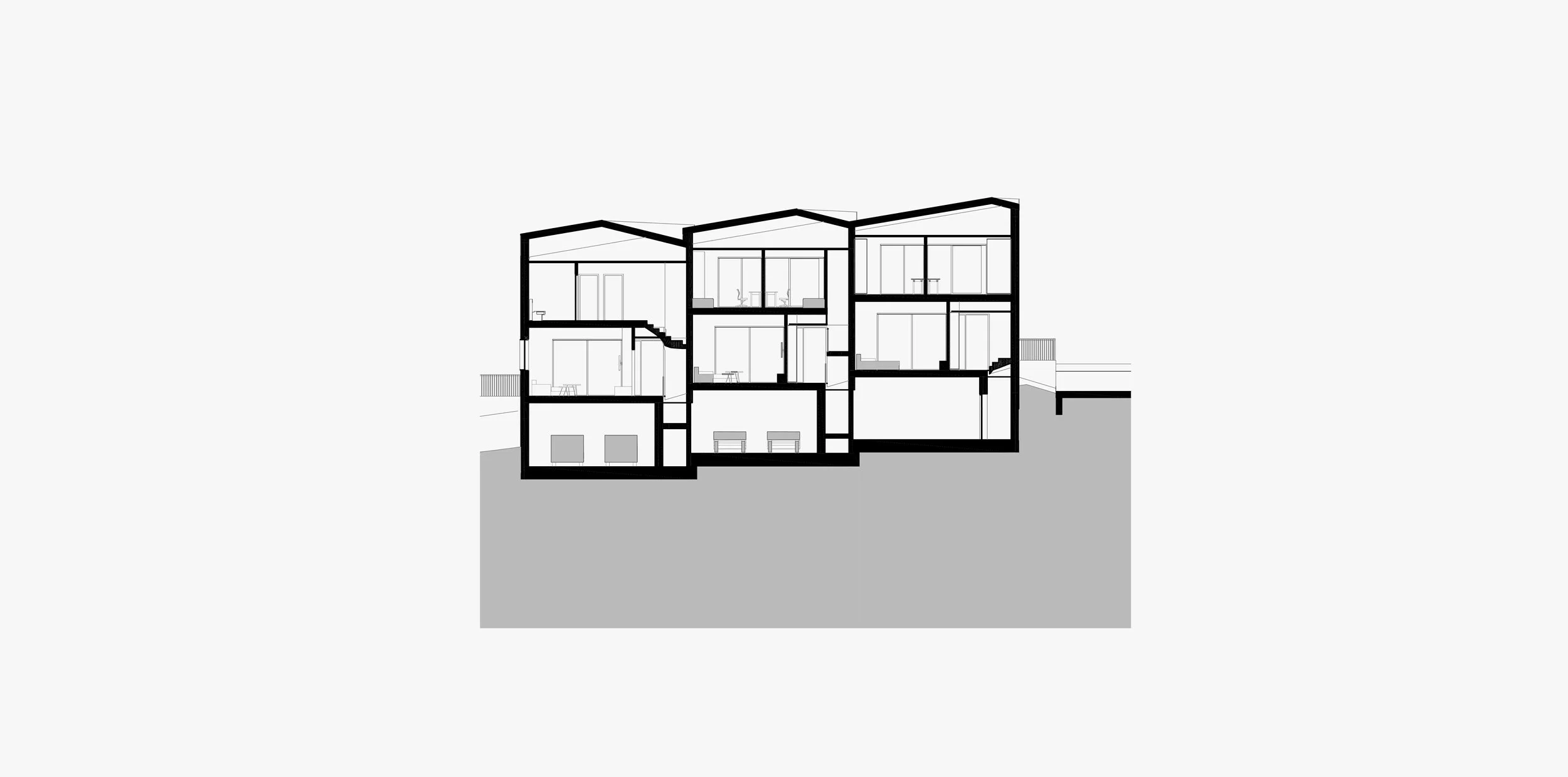 Boravci se produžuju prema loggiama koje služe kao medijatori između interijera i eksterijera. Loggie imaju važnu ulogu u kontroli insolacije, privatnosti i dubine pogleda. Njihovi skošeni zidovi formiraju precizne rubove pogleda prema širem krajobrazu, dok istovremeno štite interijer od pregrijavanja i neželjenih pogleda iz okoline. Složena kompozicija unutarnjih i vanjskih prostora stvara poluotvorene zone boravka s kontroliranom ekspozicijom i mekim prijelazom prema padini.