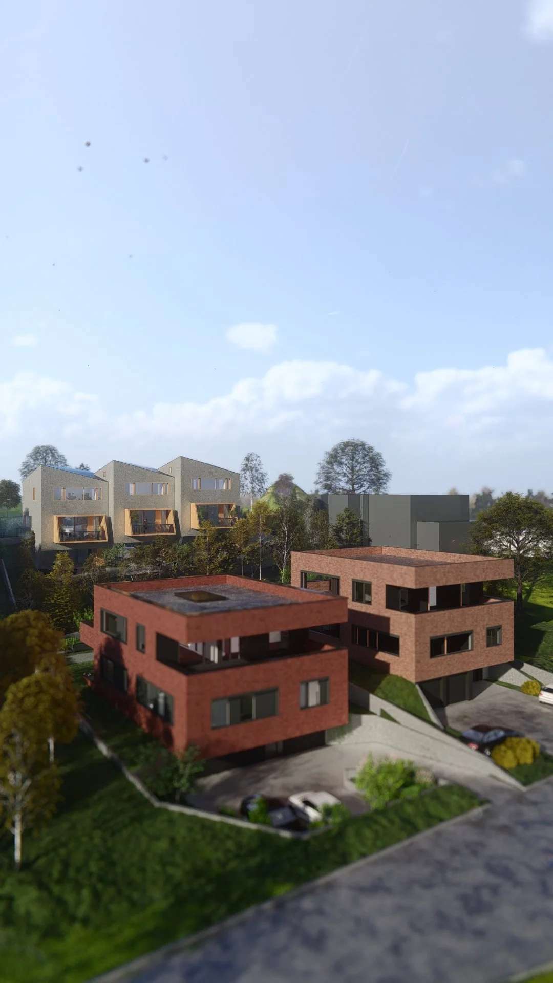 Krovovi svake jedinice dijagonalno su razlomljeni, a zajedno s tlocrtnih izmicanjima, kaskadnim presjecima i skošenim loggiama tvore dinamičan volumen nalik origami strukturama. Ova razlomljena geometrija optimizira insolaciju, naglašava individualnost svake jedinice i daje cijelom sklopu prepoznatljiv arhitektonski identitet.