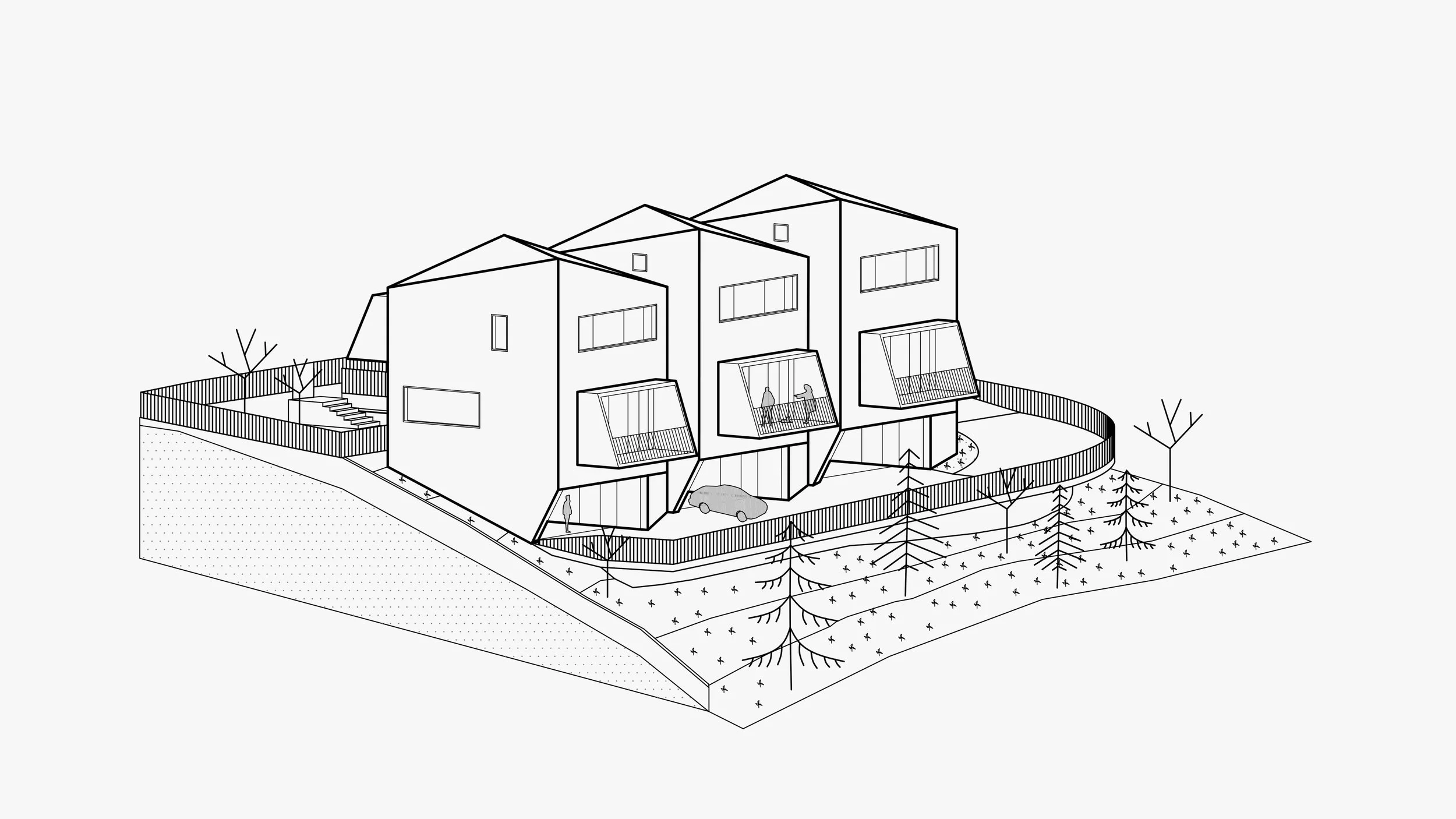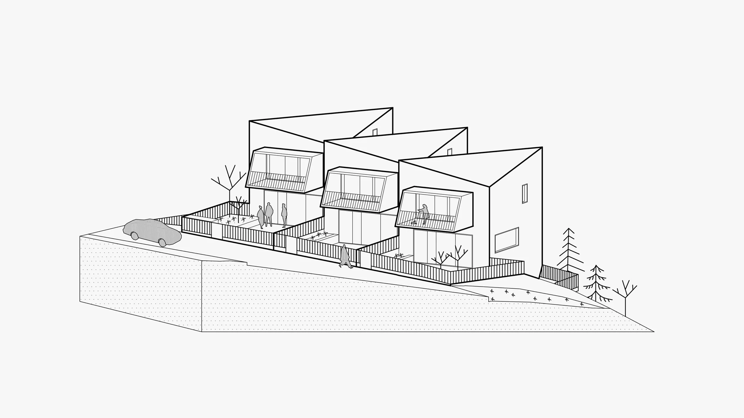 Privatni vrtovi i zelenilo uzduž padine definiraju individualne zone stanovanja i osiguravaju kontrolirane vizure između jedinica.