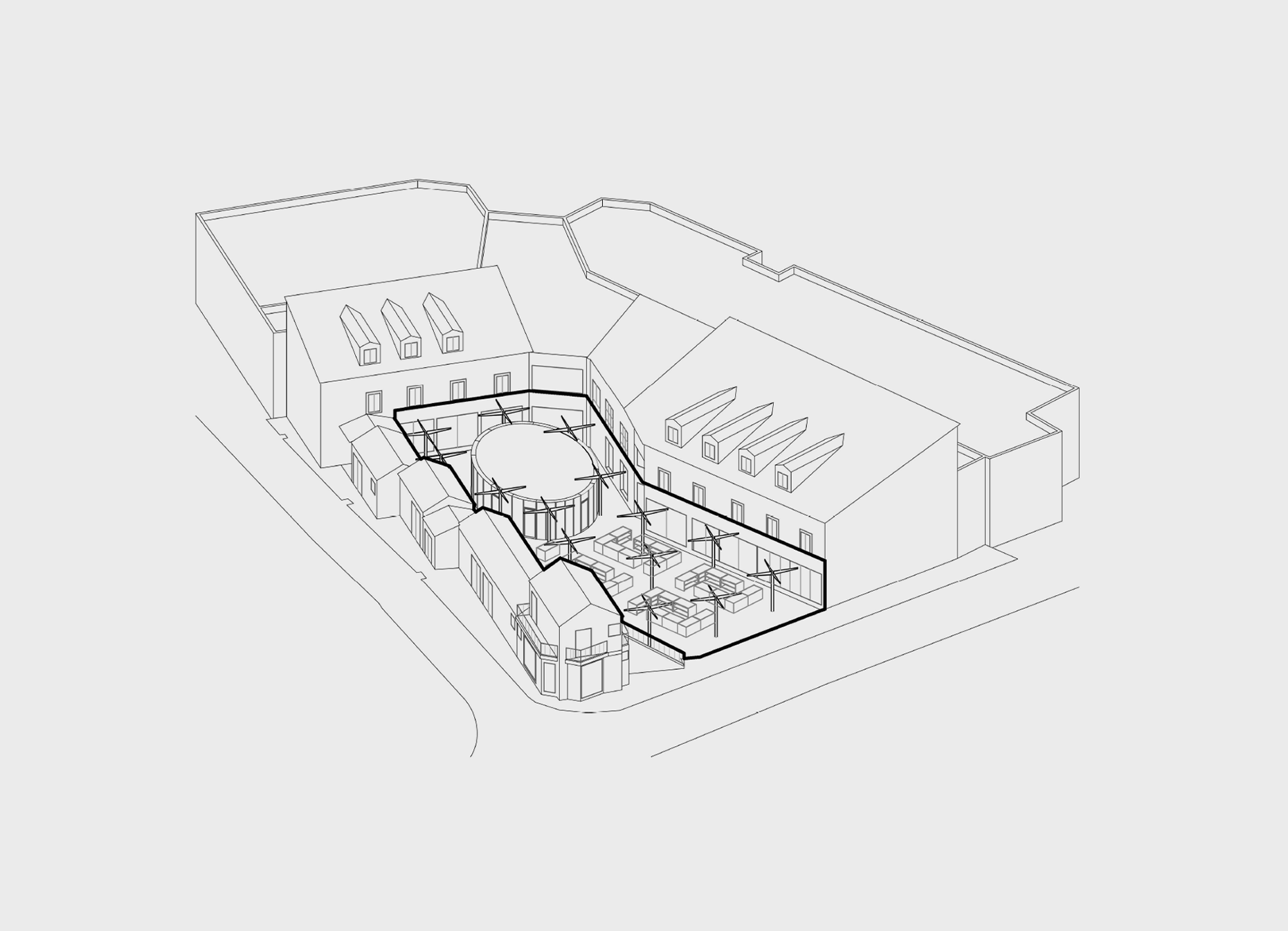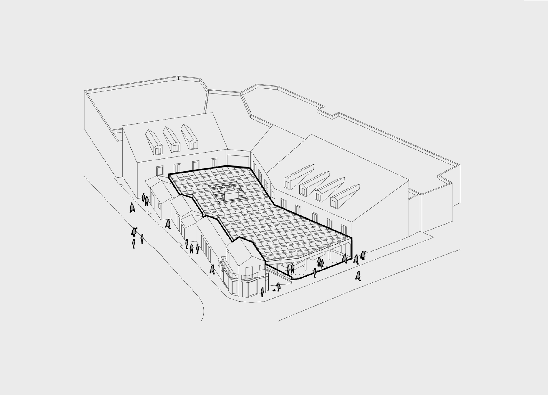Zajednička nadstrešnica čitavog obuhvata se vrlo precizno uglavljuje između postojećih zgrada i poput zakrpe popunjava prazninu čiji poprima oblik. Pažljivo je planirano zasjenjenje i prirodna ventilacija, uz istovremenu zaštitu od kiše. Nadstrešnica tržnice sadržava sustav odvodnje oborinskih voda, njen presjek omogućava prirodno provjetravanje, a obloga pločama od polikarbonata daje dovoljno prirodnog osvjetljenja, dok ujedno štiti od UV zraka i stvara sjenu. Osim toga, ugodnost mikroklime ispod nadstrešnice postiže se cirkulacijom zraka pospješenom ventilatorima. Stupovi sa vutama koji nose nadstrešnicu ujedno su i rasvjetna tijela čime se ostvario dojam njenog lebdenja.