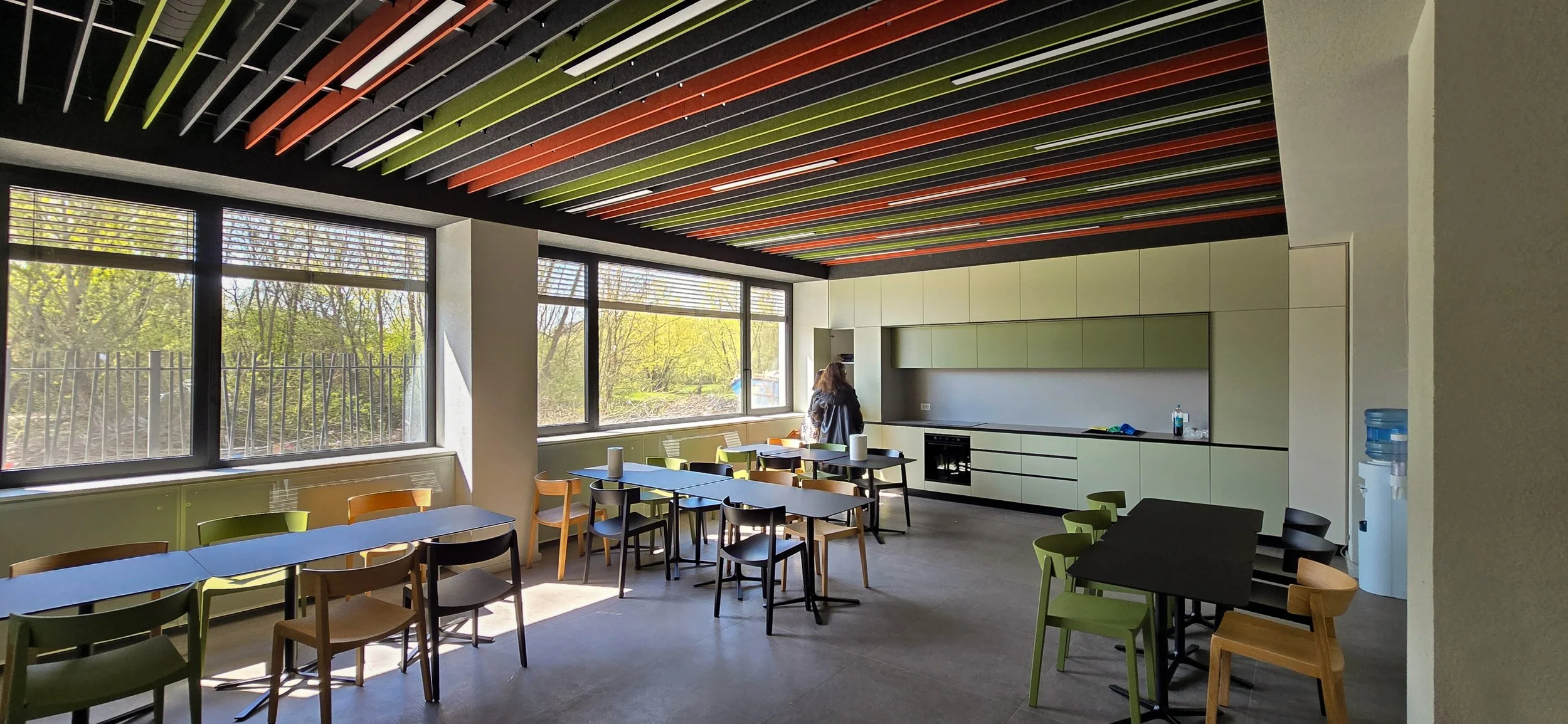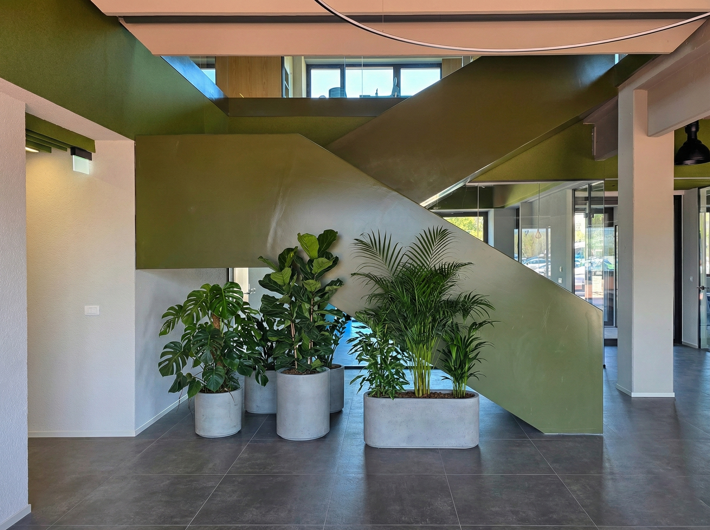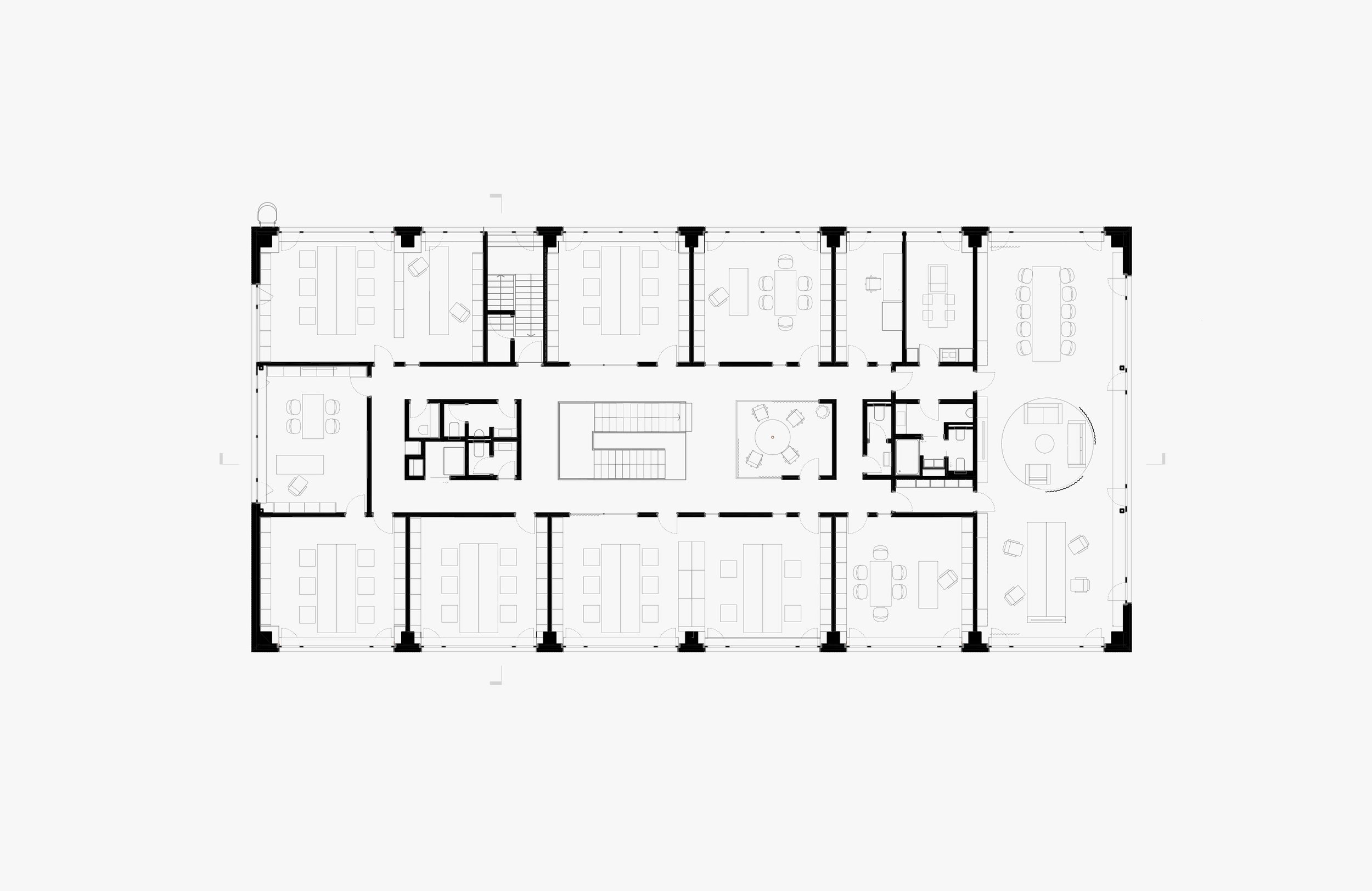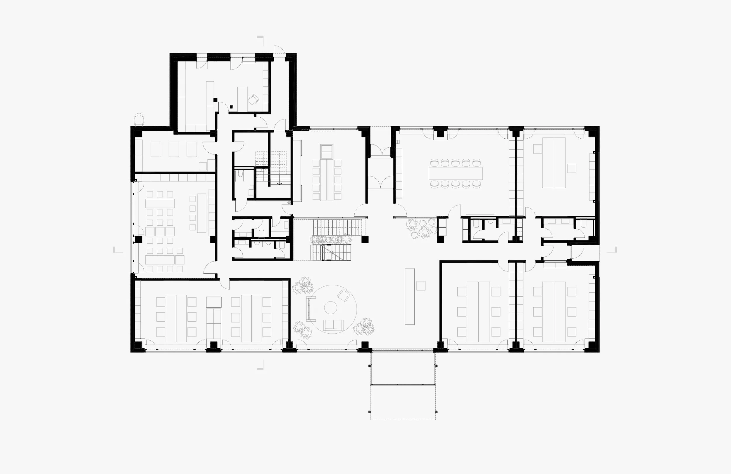 Interijer je projektiran za rad sedamdeset zaposlenika i uključuje kantinu, sobe za sastanke, lounge prostore, lobi i uredske cjeline. Organizacija je koncentrirana oko centralnog stubišta sa zenitalnim osvjetljenjem koje dovodi prirodnu svjetlost duboko u prizemlje. Materijalizacija je suzdržana i robusna: vidljivi beton, hrastove zidne obloge i akustički elementi stvaraju mirno i stabilno radno okruženje.